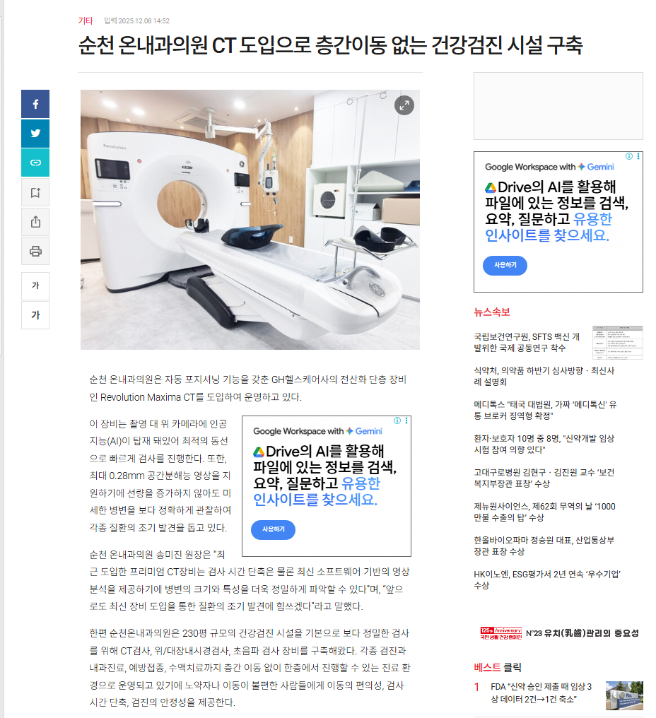 ¼øÃµ ¿Â³»°úÀÇ¿ø CT µµÀÔÀ¸·Î Ãþ°£À̵¿ ¾ø´Â °Ç°°ËÁø ½Ã¼³ ±¸Ãà